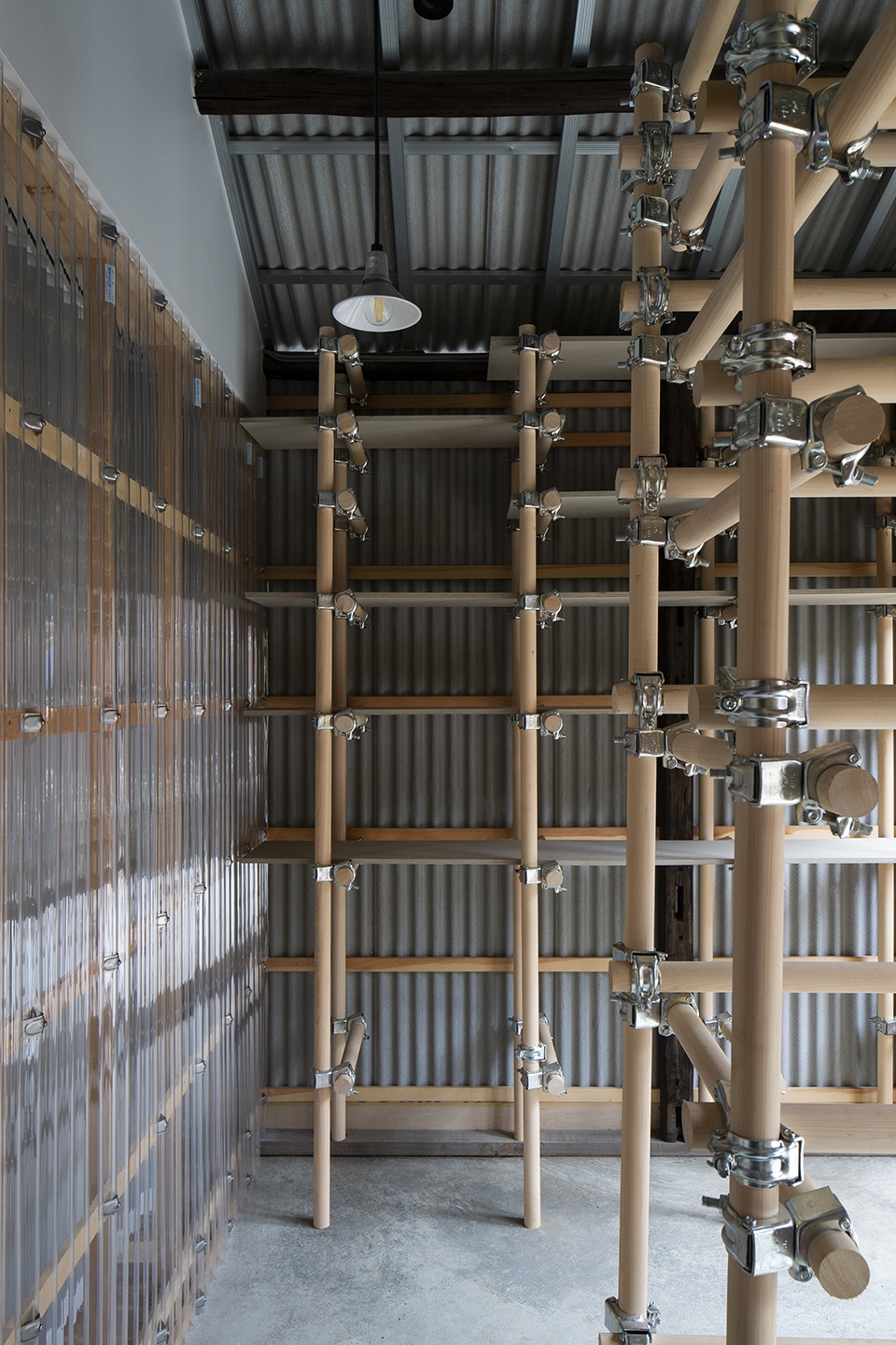 Following the intention of creating an entertaining space, the project wanted to recall a past kids playground and its typical jungle gym with wooden pipes replacing the metal ones. This was placed halfway through the entrance area, creating an inside and outside volume at the same time. During the construction, the architects decided to change the function from a warehouse to a dwelling, with a big enough entrance that could host different activities: from an exhibition space to an atelier, the moktankan helps to give the ambience the freedom of adding and removing elements according to the needs.