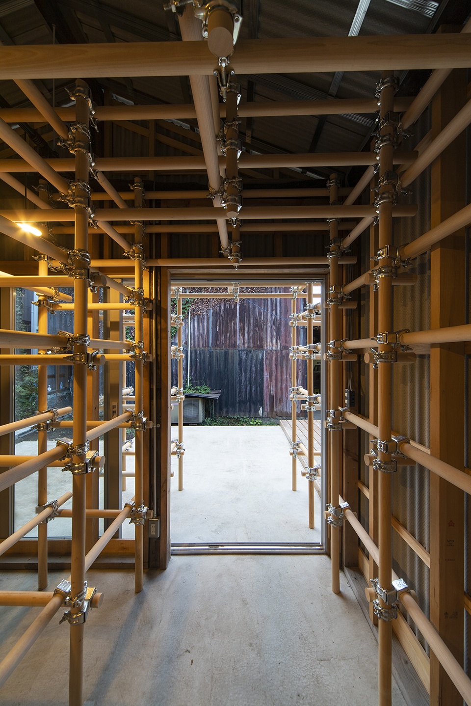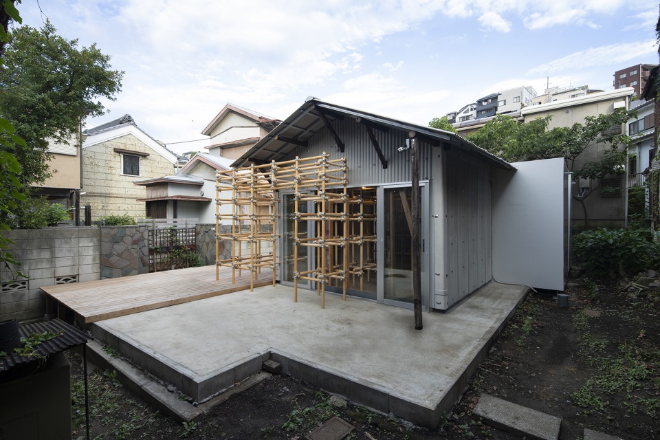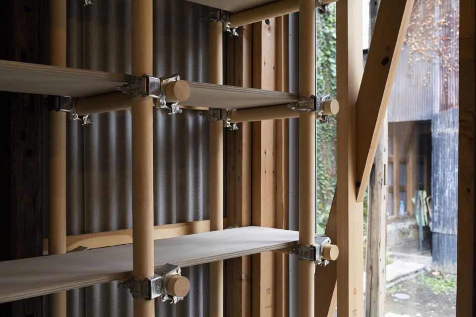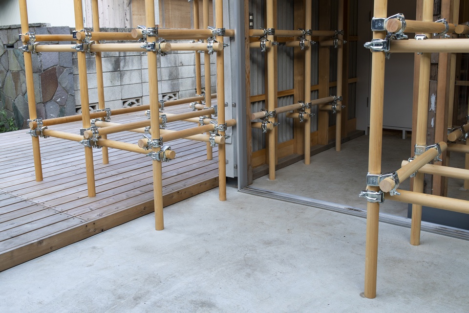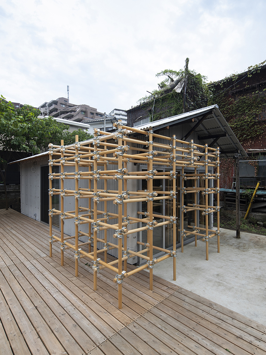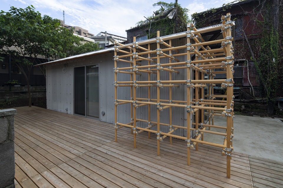 For the outside, the architect saw this opportunity as the best chance to experiment with their latest constructive method called moktankan : a modular system based on wooden clamp-connected pipes with multiple shapes possible that can find a use in a large variety of ways. The idea is coming from the metal scaffolding normally seen on construction sites, with this being much lighter thanks to the wood, and potentially a permanent structure.