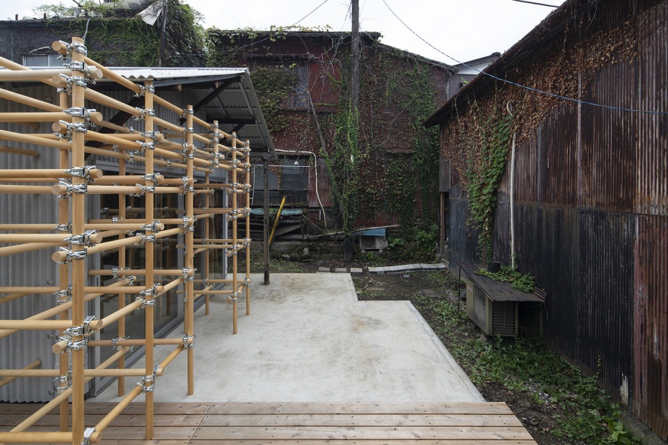 为了给空间增添童趣的氛围,建筑师采用木管代替金属管,勾勒出儿童游乐场中典型的攀爬架,将人们的回忆带回无忧无虑的童年。该装置被放置在入口区域的中间,同时创造出一个联系内外的空间体量。在建造过程中,建筑师决定将原本预想的仓库功能改变为住宅,并为空间设置一处面积可观的入口玄关,使其可以满足从展览空间到工作室的不同活动需求。“moktankan”则为使用者赋予了根据需要添加或删除空间模块的自由。