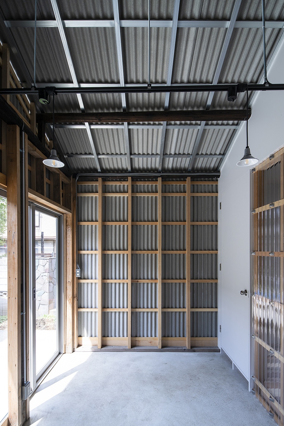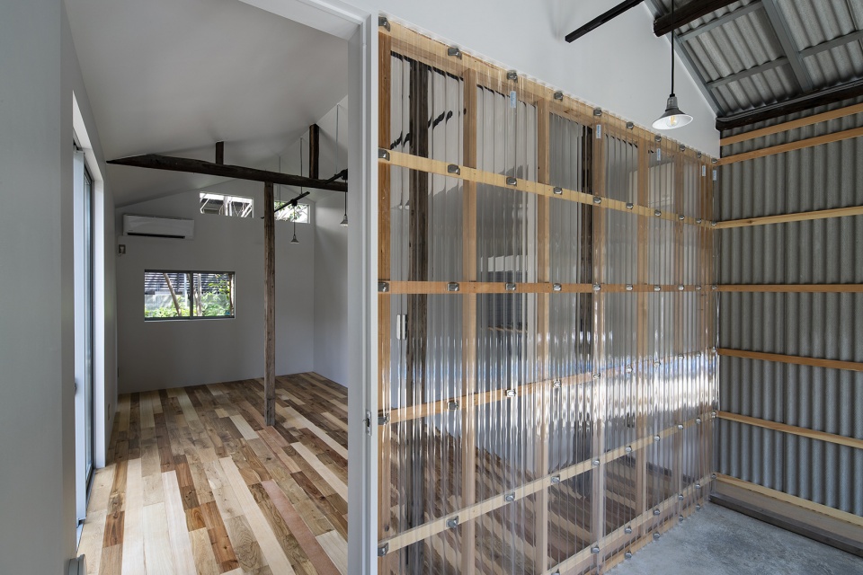 作为一栋尺度相对较小的建筑,本住宅的平面采用了极简而高效的布局方式:现有的结构元素定义了卧室和起居室,而厨房和浴室则被安置在两个扩建的封闭体量中。此外,建筑师还沿着建筑的南立面和混凝土基座设计了一处木制平台,旨在增强室外花园以及“moktankan”空间的舒适性,营造出愉快休闲的户外氛围。建筑立面采用了类似于日本传统仓库的波纹板,进一步减少了整个项目改造的预算成本。玄关的有机玻璃隔断则延续了外立面金属板的波纹形式,保持了室内外空间的和谐。