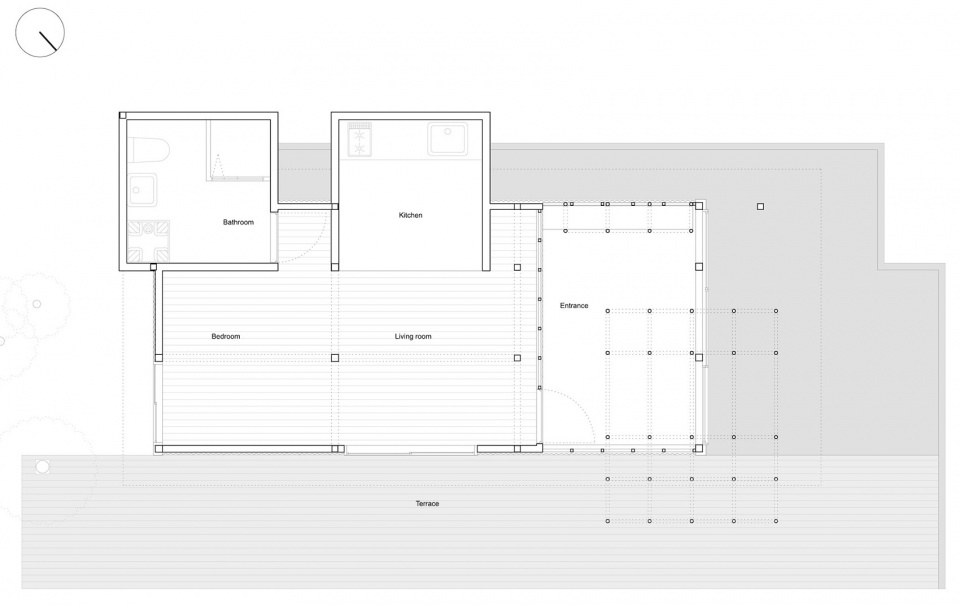Being a relatively small building, the floor plan is minimal but efficient: the existing structural elements define the bedroom and living, while both kitchen and bathroom have been enclosed in an expansion box each. A wooden deck develops along the south facade of the building and the concrete base, providing a pleasant atmosphere for the garden and the moktankan. For the facade, the corrugated sheets resemble an old Japanese warehouse and reduce the budget. Similarly, the corrugated plexiglass in the doma keeps the typical image and maintains harmony with the exterior material.