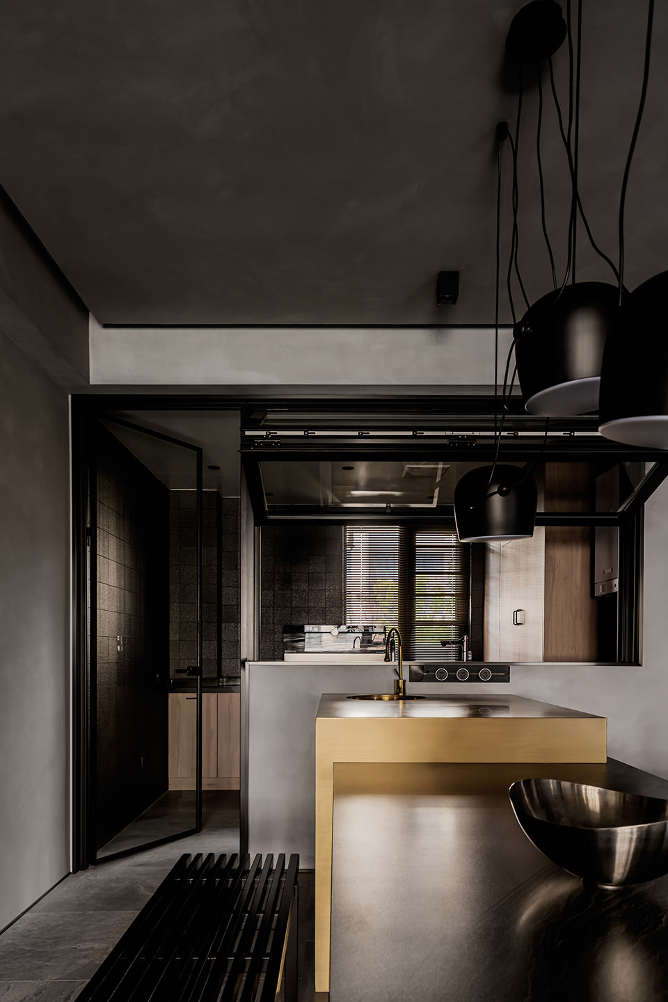 In the dining room, the entire structure of the island is made of metallic brass, while the dining table is made of rock slabs with metal support structures embedded inside. The metal brass island and the rock plate dining table are closely intertwined, which is a beautiful presence in the space like a sculpture of “David”.