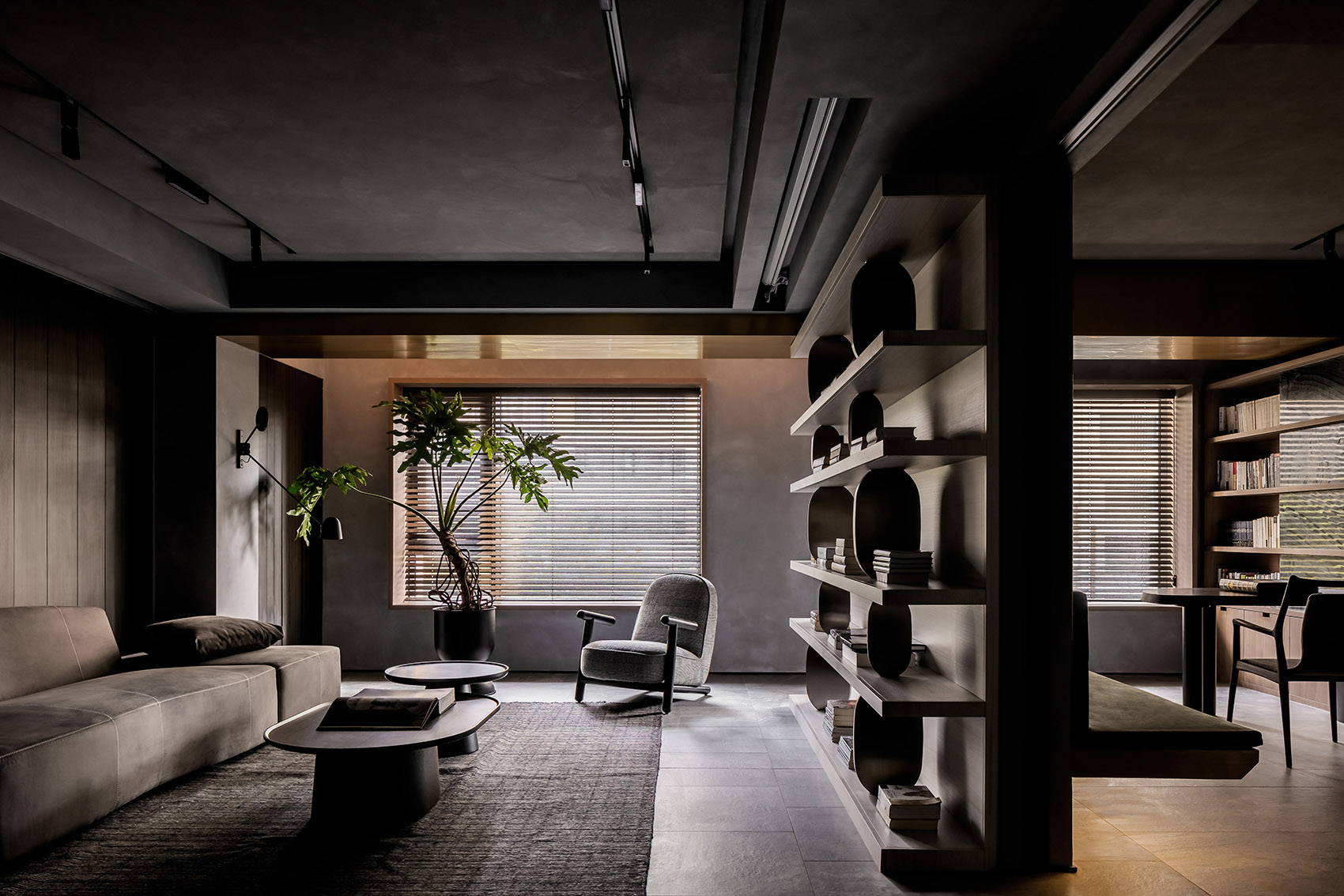 As far as the eye can see, black and brown natural wood veneer, medium gray art paint, deep gray matte floor tiles, deep gray rock slabs are lined up in front of the eyes, and the breath of rational and handsome arises naturally. Metal brass and soft decoration, such as sofa carpet and green plants, are integrated into the space. At the same time, a large number of natural wood veneer elements are filled everywhere in the space, which also harmonizes the rational atmosphere of the space to a certain extent. At the same time, the texture is also infinitely profound details, to achieve a delicate balance between rationality and sensibility.