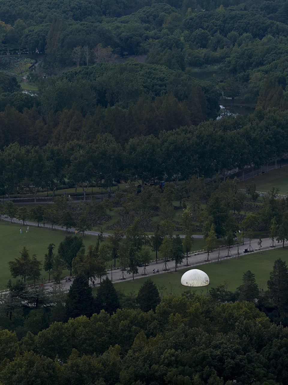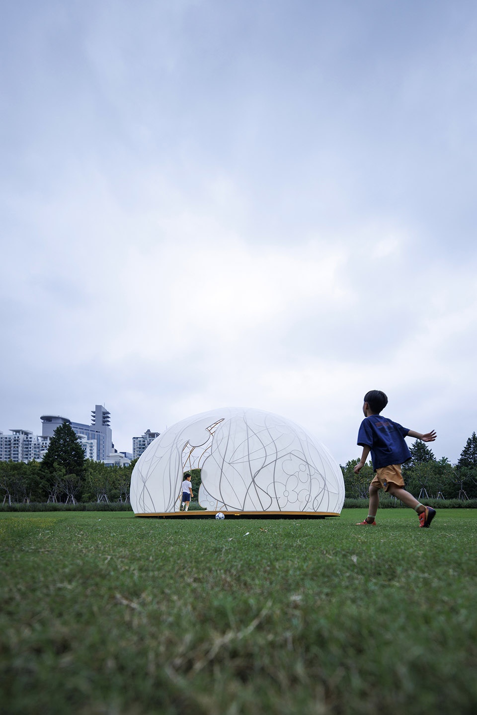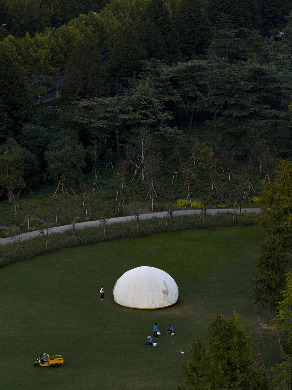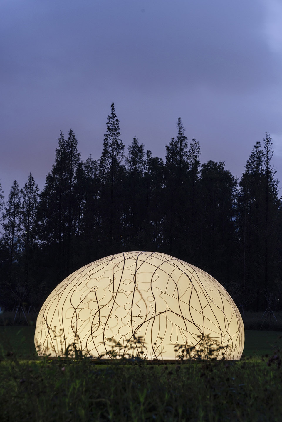 The pavilion rests on the semicircular lawn of Century Park like a translucent full moon descending in quietness. Its spatial framework weaves traditional osmanthus motifs into vine-like bronze patterns, while lightweight elastic fabric stretches across the surface to form the moon’s luminous skin. The design pays tribute to the ‘golden cabbage’ of the Vienna Secession while aspiring to evoke the romantic sci-fi sensibility of Buckminster Fuller domes. Delicate, radiant, and fragile — it embodies the timeless yet brittle joy and longing that the ‘moon’ and the ‘osmanthus’ have evoked through the ages.
