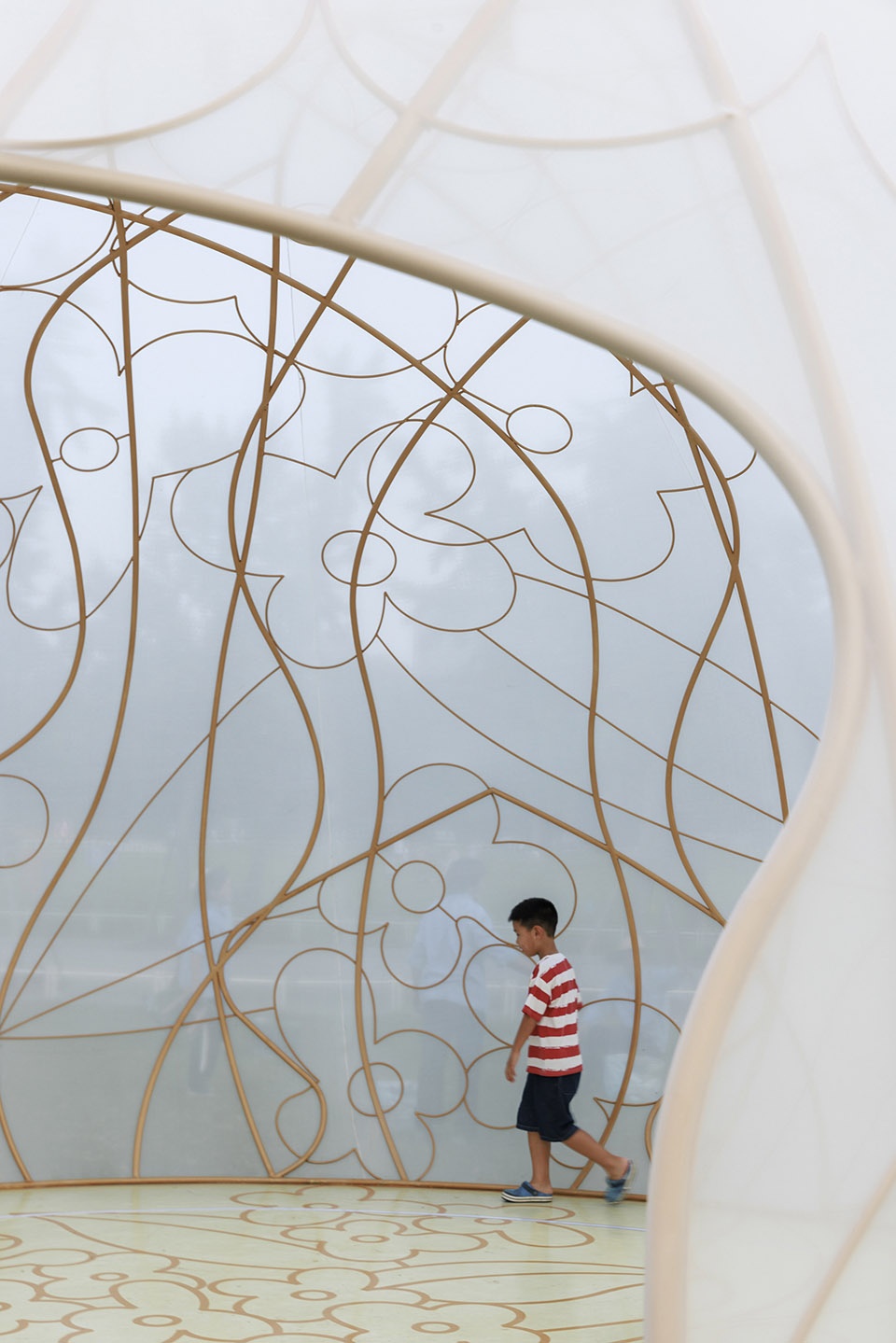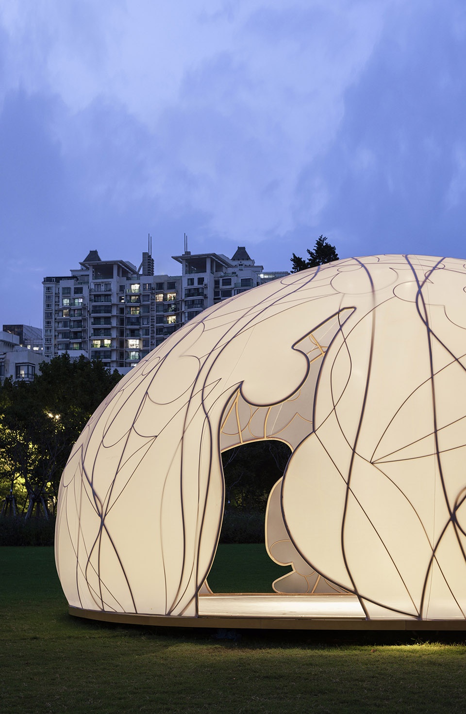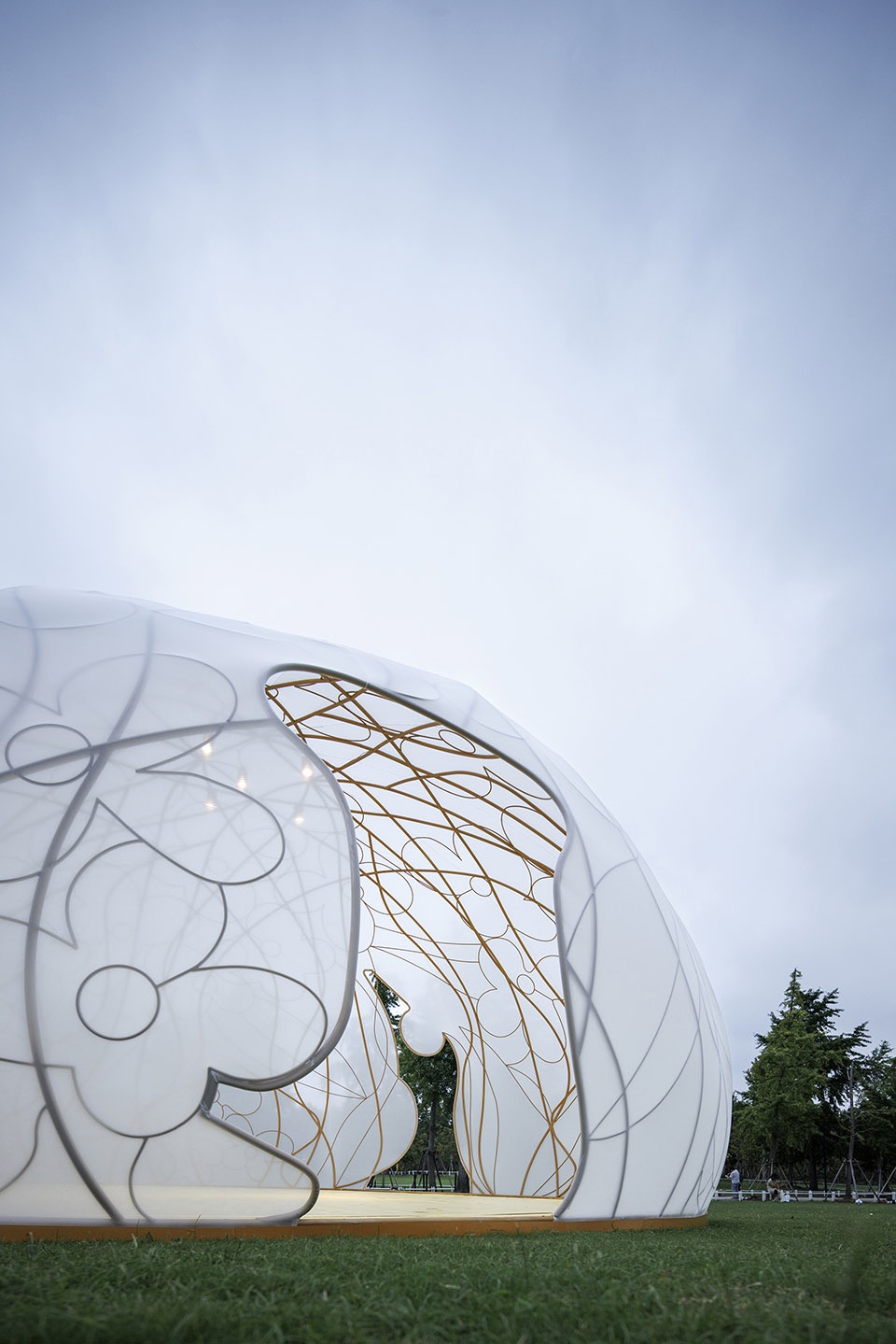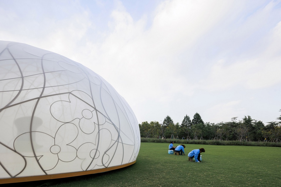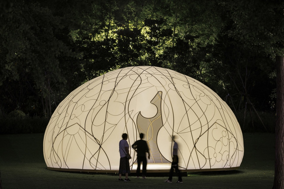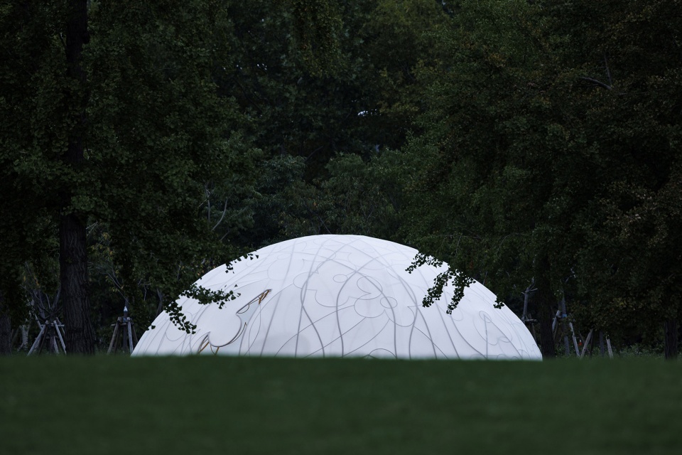 展亭如一轮半透的圆月,宁静降落于世纪公园半月形大草坪。藤蔓般的传统桂花纹样编织出金铜色的空间网架,轻盈的弹性织物覆盖成月的表面。它致敬了维也纳分离派的镀金圆顶,同时试图创造福勒穹顶式的浪漫科幻。精巧、明亮、脆弱,就像古往今来“月”与“桂”带给人易碎又永恒的喜悦与叹息。