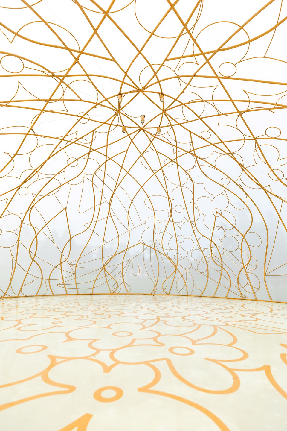 The osmanthus patterns painted on the ground by the Zao Hua artist mirror the golden lattice of the dome above — each a projection of the other. Together, they form a complementary dialogue between on-site and prefabrication, movement and stillness.
